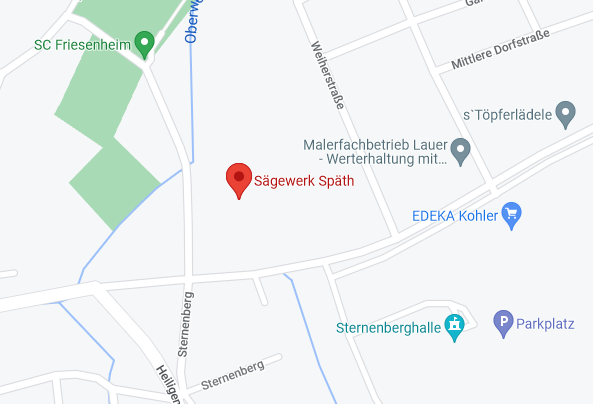 Wir sind hier Sägewerk Späth GmbH | Oberweierer Hauptstraße 102 | 77948 Friesenheim info@spaeth-holz.de 07821-6646 07821-6695 ÖffnungszeitenMontag – Freitag07:30 – 12:00 Uhr13:00 – 17:00 UhrSamstag08:00 – 11:30 Uhr Mit Klick auf Google Maps stimmen Sie der Weiterleitung und dessen Nutzung zu.Die Datenschutzerkklärung & Nutzungsbedingungen finden Sie hier .